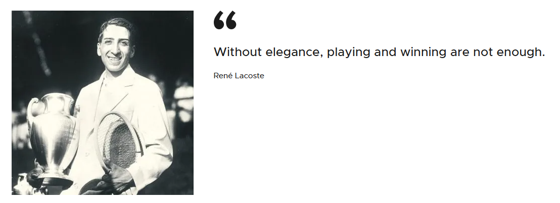 브랜드의 창업자인 르네 라코스트는 1920년대를 걸쳐 전 세계를 제패한 테니스 스타였습니다. 코트에서 끈질기게 상대를 물고 늘어지는 플레이어로 유명해서 '크로커다일'이라는 별명이 있었는데 , 그의 친구 로베르 조르주(Robert George)가 블레이저에 자수하여 주었고 라코스트가 블레이저를 입고 시합에 나감으로써 악어가 그의 상징이 되었습니다.