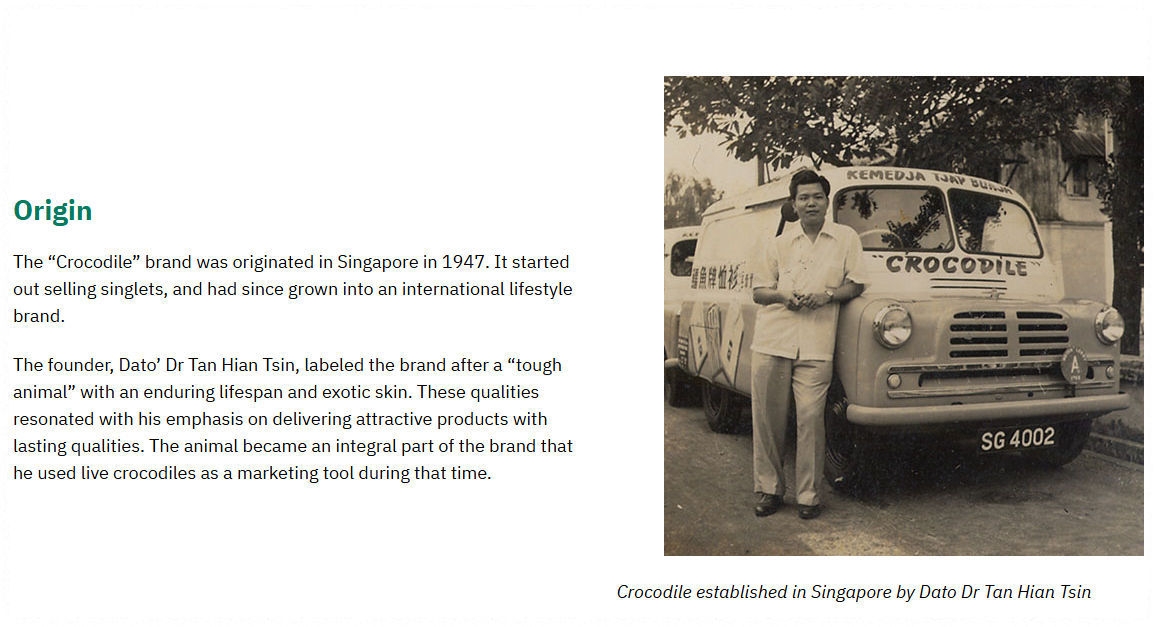 크로커다일은 1947년 싱가포르에서 설립된 브랜드입니다. 크로커다일은 주로 아시아 시장을 타겟으로 하여 다양한 의류 제품을 선보이고 있습니다. 이 브랜드 역시 악어 로고를 사용하지만, 라코스테와는 다른 디자인과 스타일을 가지고 있습니다. 크로커다일은 가격이 비교적 저렴하여 대중적인 인기를 끌고 있습니다. 국내에는 패션그룹 형지가 1996년에 상표권을 사 와서 크로커다일레이디를 내고 이 브랜드가 대박이 터지면서 국내에 인지도를 갖게 되었습니다.