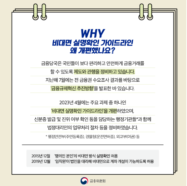 이에 금융위원회는 지난 2022년 7월 ' 비대면 실명확인 제도'의 개선을 포함한 '금융규제혁신 추진방향'을 발표하였습니다.