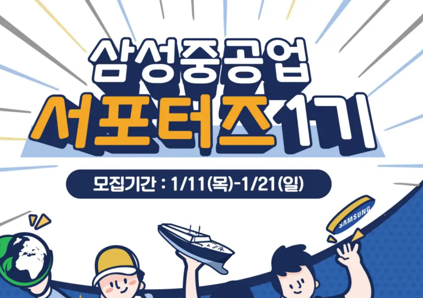 삼성중공업에서 서포터즈 1기를 모집한다고 합니다. 아래 모집대상, 우대사항, 활동 안내 등을 참고해서 지원해 보시고 향후 취업을 준비할 때 작은 도움이 될 수 있었으면 좋겠습니다.