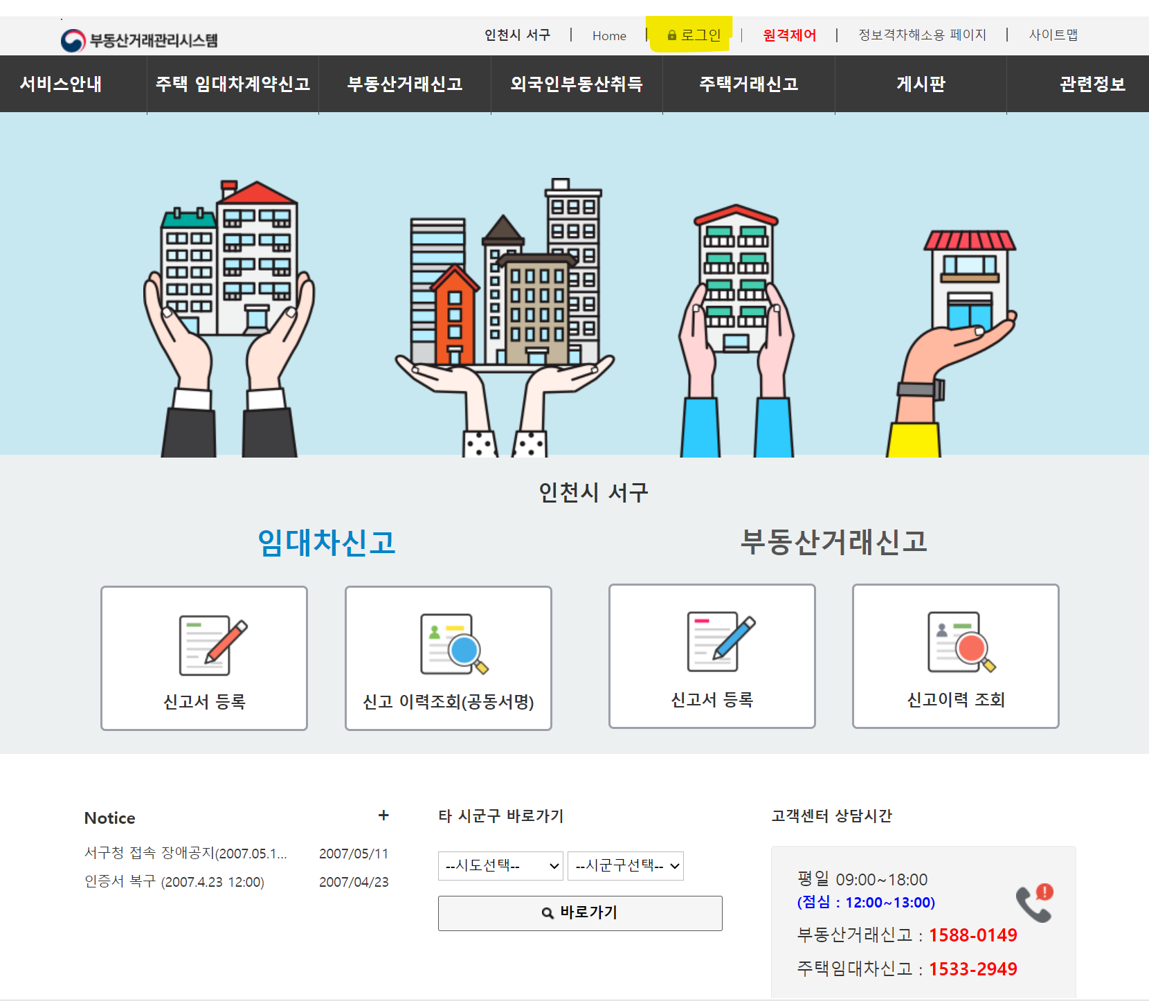 2) 로그인 : 시군구 메인화면에서 상단 메뉴의 [로그인] 버튼을 클릭하여 로그인 절차를 진행합니다. 공동인증서 로그인 절차를 통해 로그인을 완료한 후 임대차 신고를 진행하시면 됩니다.