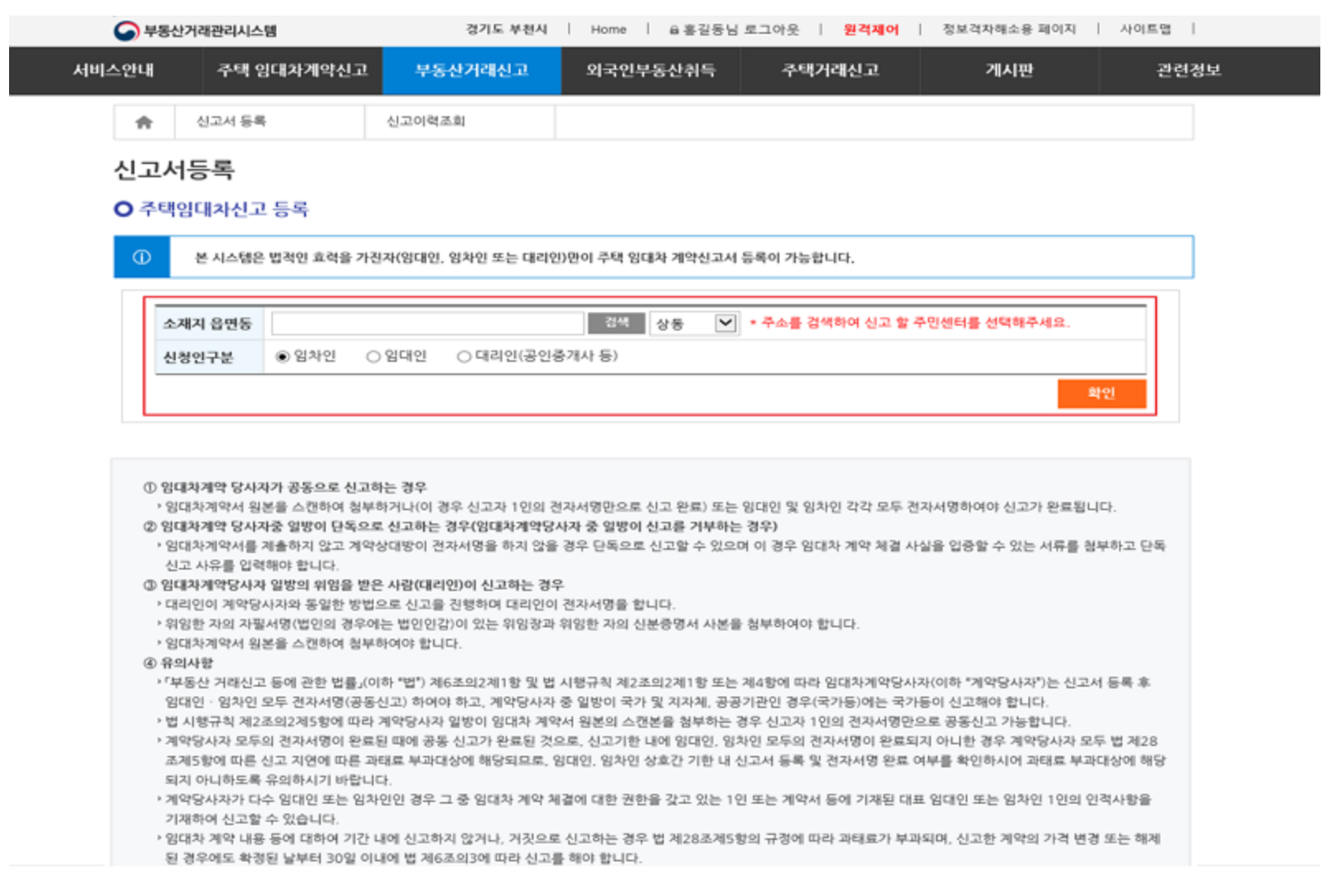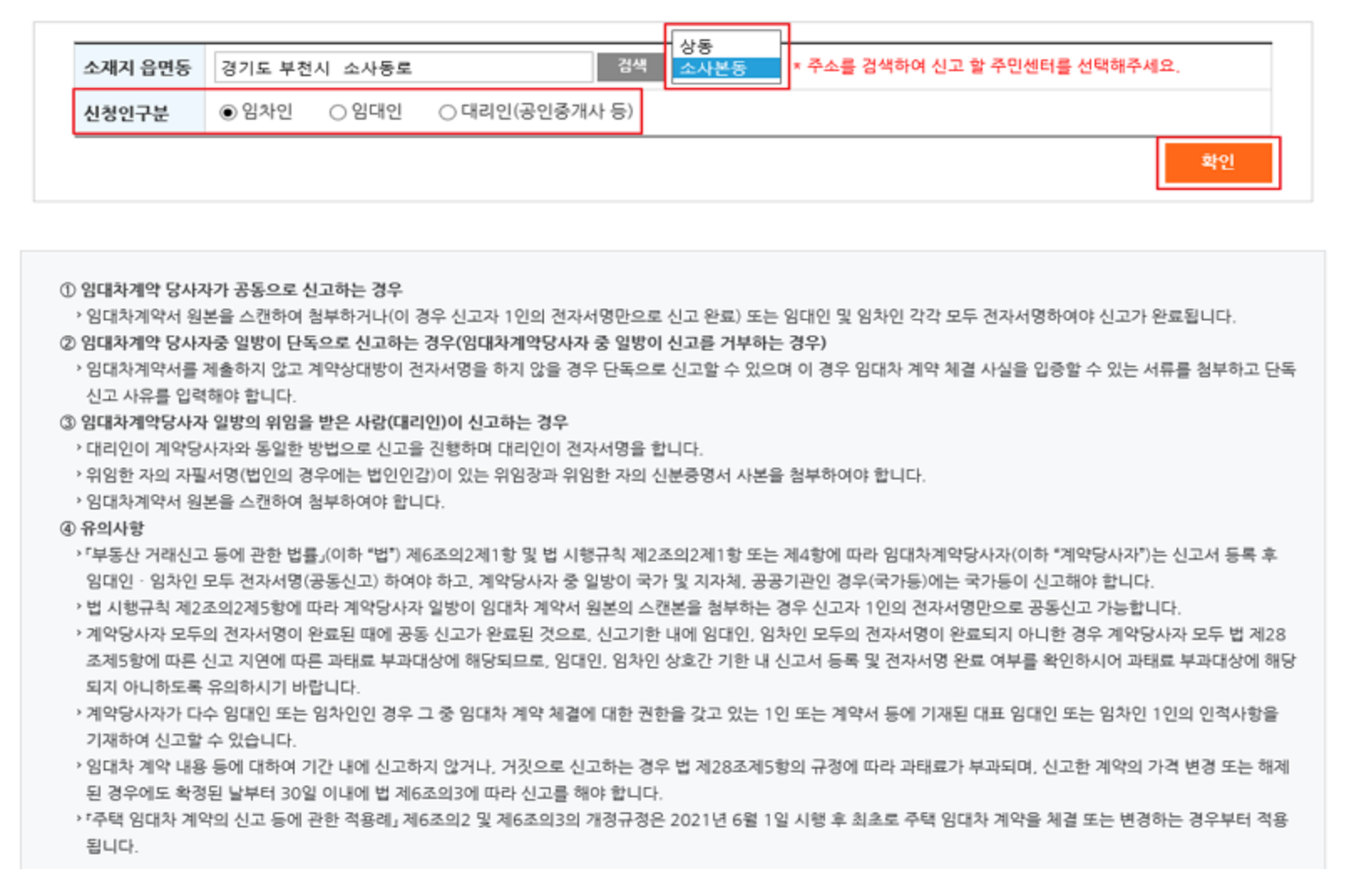 임대목적물의 소재지를 [검색] 버튼을 클릭하여 도로명 또는 지번을 입력하여 검색하고, 검색된 주소지의 신고할 주민센터를 선택하고 [신청인구분]을 선택한 후 [확인] 버튼을 클릭합니다.