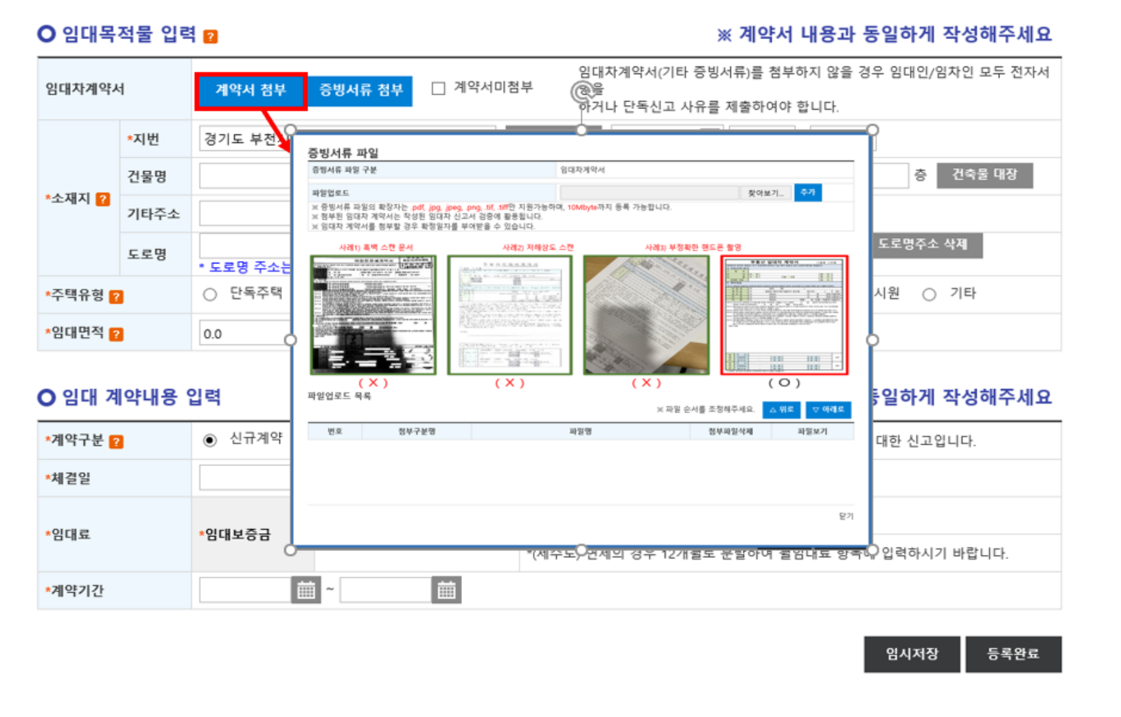 임대목적물의 소재지와 주택유형, 임대면적 등 정보를 입력합니다. 임대차계약서를 첨부 시 [계약서 첨부] 버튼을 클릭하여 파일을 업로드할 수 있습니다.