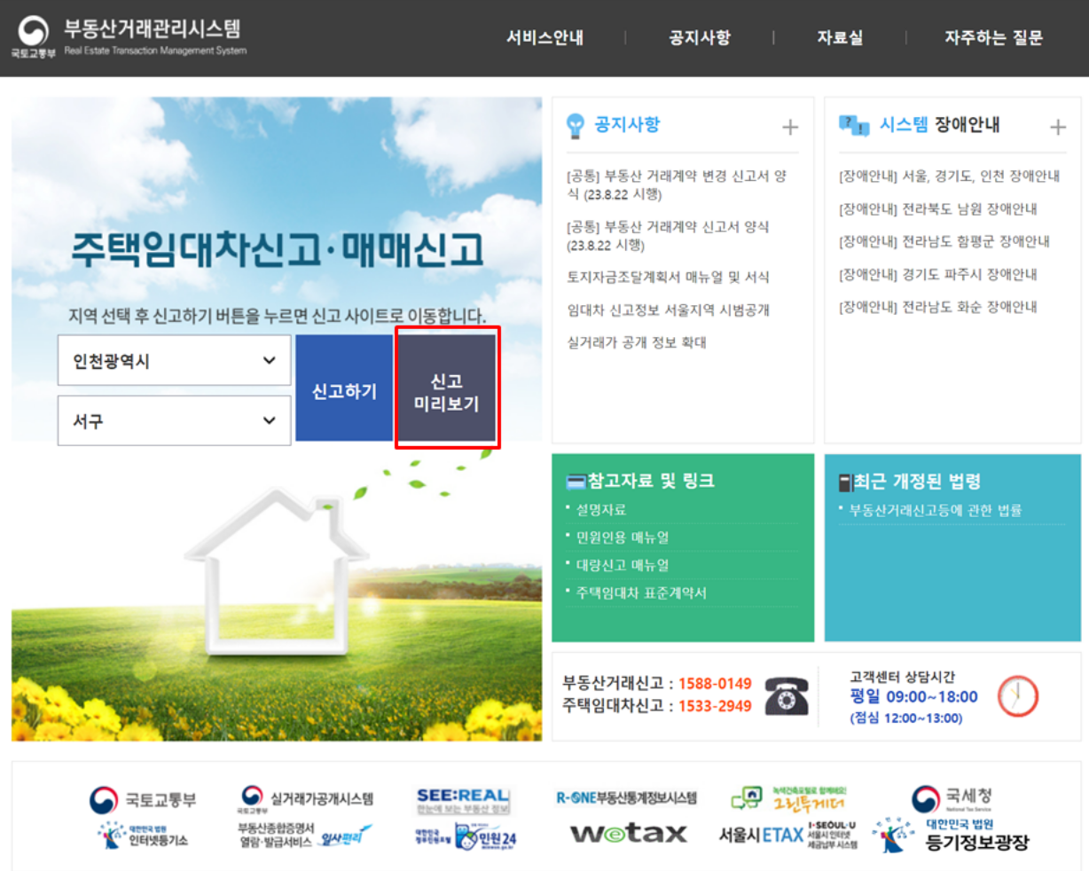부동산거래관리시스템에 들어가 아래 신고미리 보기를 버튼을 클릭하시면 주택임대차신고 절차를 화면예시와 함께 확인하실 수 있으니 참고하세요.
