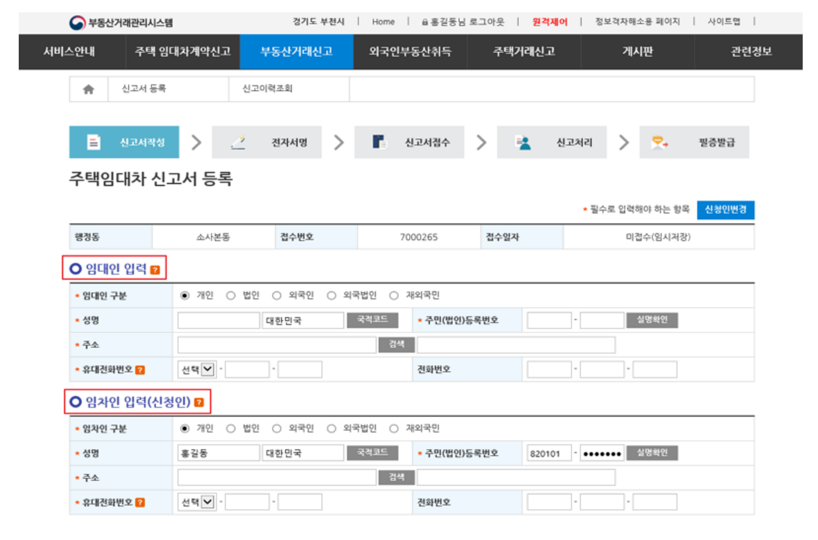 임대차 계약당사자 (임대인, 임차인) 정보를 입력합니다.