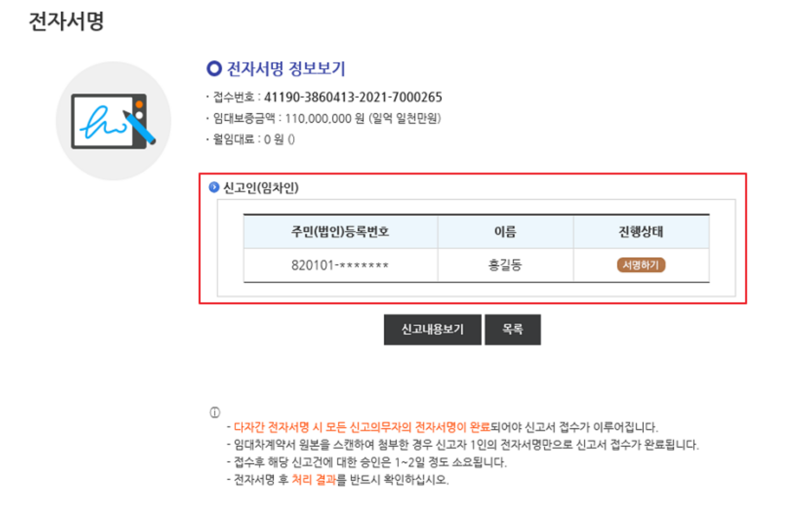 임대차신고서 작성이 끝나면 [작성완료] 버튼을 클릭하여 전자서명 페이지로 이동하여 [서명하기] 버튼을 클릭하여 전자서명을 완료하면 신고가 완료됩니다.
