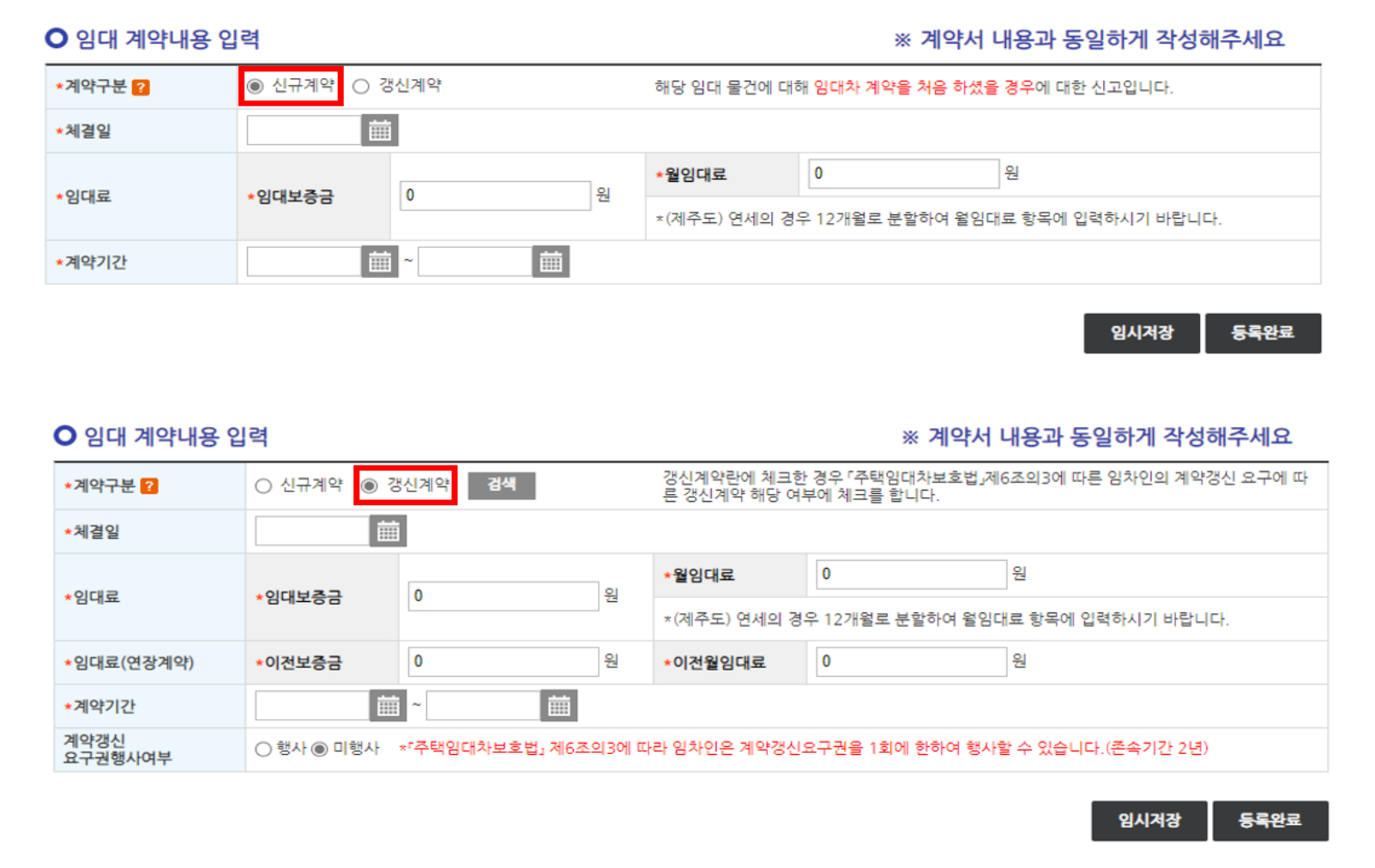 임대목적물의 소재지검색을 통해 주소와 건물명을 입력하고, 임대 계약내용을 입력합니다. 참고로 계약구분(신규/갱신)에 따라 입력 항목이 다르니 해당하는 계약구분을 선택한 후 내용을 입력합니다.
