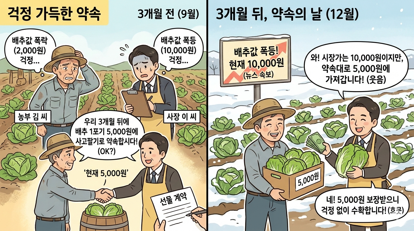 이때 두 사람은 **'3개월 뒤에 배추를 무조건 포기당 5,000원에 사고팔자'**라고 미리 약속을 합니다.