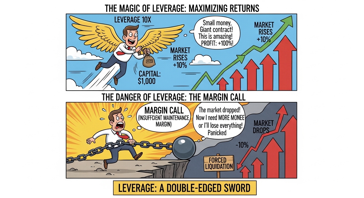 **레버리지는 '양날의 검'**입니다. 예측이 맞으면 수익이 마법처럼 늘어나지만, 예측이 틀리면 손실 역시 마법처럼 불어납니다.