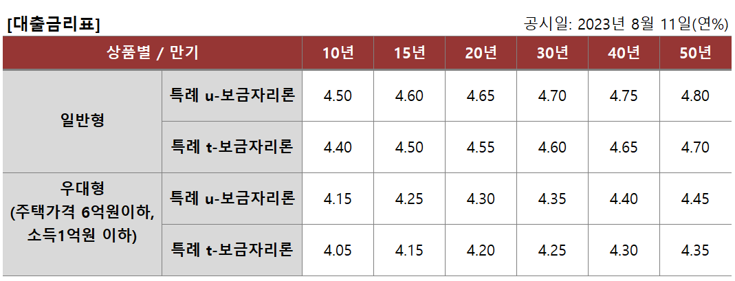 대출 금리는 차주 특성별로 우대형과 일반형으로 구분돼 적용되는데, 주택가격 6억 원 이하면서 부부합산 소득이 1억 원 이하인 경우는 우대형 금리인 4.65~4.95%를 적용받고, 나머지는 4.75%~5.05%의 일반형 금리를 이용할 수 있습니다.