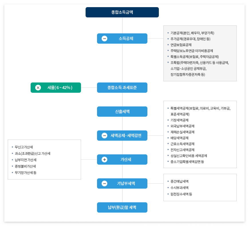 소득공제 (기본공제 등)를 한 금액을 과세표준으로 하여 세율을 곱하는 구조. (아래 세액계산 흐름도 참고)