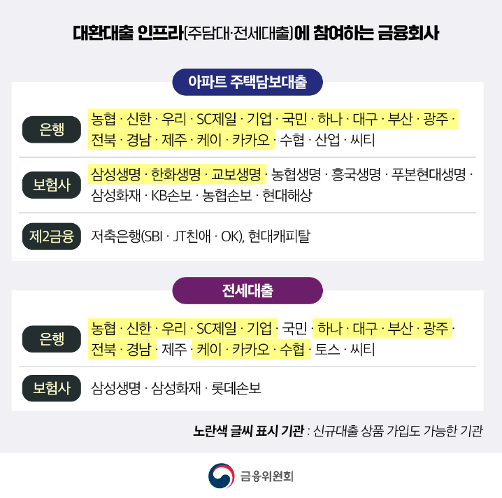 비대면으로 대출을 갈아탈 수 있도록 한 '대환대출 인프라'대상에 아파트 주택담보대출(주담대)과 전세대출도 포함된다고 합니다. 금융위원회와 금융감독원은 아파트 주택담보대출은 1월 9일부터, 전세대출은 31일부터 대환대출 인프라에서 갈아탈 수 있게 된다고 발표하였습니다.
