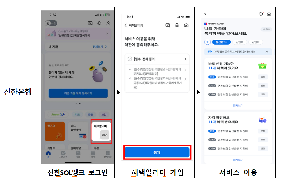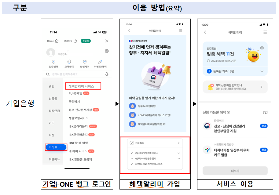 특히, '혜택알리미'는 국민이 쉽고 편리하게 이용할 수 있도록 은행 앱 등 민간 앱에서 서비스를 가입, 이용할 수 있도록 구축됐습니다. 한번 가입하면 추가 접속하지 않아도 탈퇴 시까지 계속해서 알림 서비스를 제공하므로, 이용자가 직접 접속하여 찾아봐야 했던 기존 공공 누리집보다 편리하게 이용할 수 있습니다.