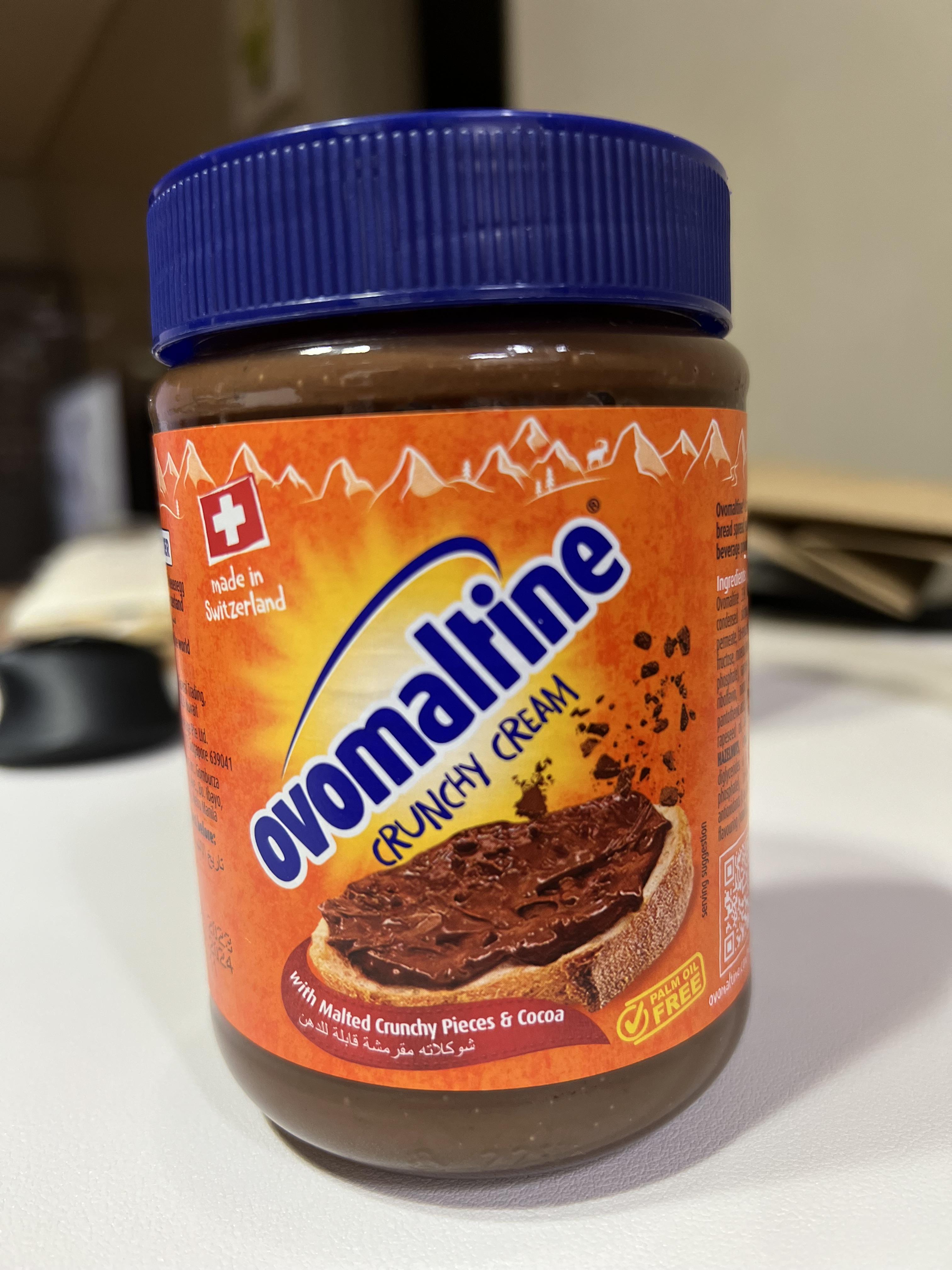 Ovomaltine 초코 스프레드는 스위스에서 시작된 Ovomaltine 브랜드의 제품으로, 오버몰틴이라는 보리와 코코아가 혼합된 원료로 만들어진 초콜릿 스프레드입니다. 일반적으로 빵이나 크래커에 발라 먹거나, 팬케이크, 와플 등 다양한 디저트에 활용됩니다.